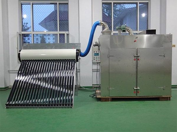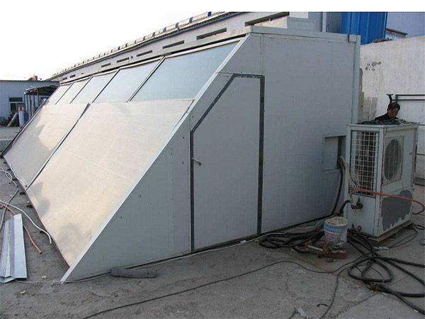 熱泵助推式太陽(yáng)能烤房主要由太陽(yáng)能空氣集熱器、空氣源高溫?zé)岜?、智能化烤房系統(tǒng)三部分組成。通過太陽(yáng)能空氣集熱器對(duì)空氣進(jìn)行加熱,利用循環(huán)風(fēng)機(jī)通過管道將高溫空氣傳輸?shù)娇痉吭诳痉績(jī)?nèi)通過太陽(yáng)能空氣集熱器對(duì)   空氣進(jìn)行加熱,利用循環(huán)風(fēng)機(jī)經(jīng)過管道將高溫空氣傳輸?shù)娇痉績(jī)?nèi);通過溫、濕度感應(yīng)器檢測(cè),根據(jù)所測(cè)溫、濕度和干燥工藝,由智能化控制器控制空氣源熱泵的啟、停,排濕門的開、閉、實(shí)現(xiàn)全自動(dòng)干燥。